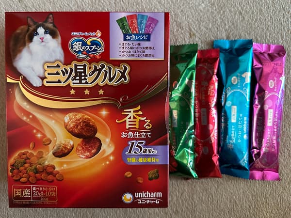 以前から、20g ずつの小袋の銀のスプーンをあげていたので、腎臓に配慮した15歳用の小袋も、花ちゃんは袋が同じと思って騙されたのか、食べてくれました。