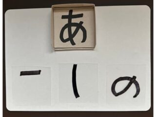 10行の表に子どもがあ行から文字を収めていく時は、ベニヤ板・ボール紙・缶の蓋・ホワイトボードなどで、左の他の行を隠せば、見え方が整理されて、視界が楽になる、