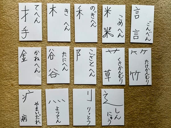 1枚1枚カードに書く準備が大変な場合は、教科書の巻末の漢字を200%に拡大すると大きくなり、冠・偏・旁をハサミで切って分解合成できますし、蛍光ペンで冠・偏・旁を視覚的に区切りながら、冠・偏・旁を音声で言う学習もできます。