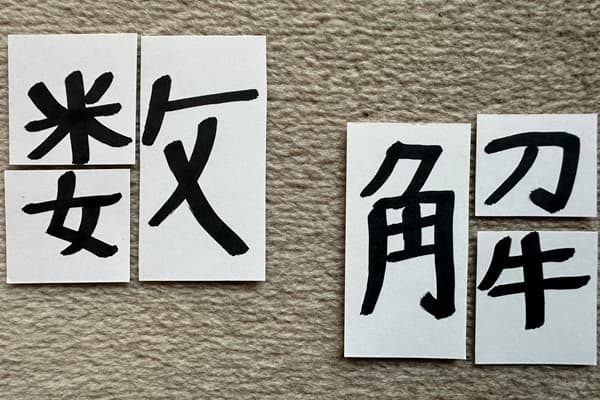 漢字も、ひらがなの「あ」と同様に、カードに書いて、ハサミで切って、分解と合成を行ないます。
