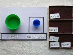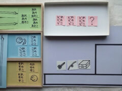 教材は、単語から文章構成へ移行する方法 の多語連鎖、動詞の学習の進め方 の動詞学習、事象と文章の対応の強化法 の大小比較構文の学習でも使った、2構文のボール紙枠などの、定型の材料を今回も使う。