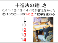 そこで、6の段から9の段まで、九九の答えの数字タイルを並べる、九九正答教授法というのを思いついた。