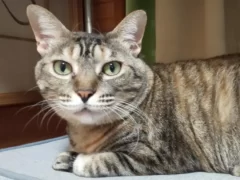 短毛のキジトラ模様と、可愛い口元の点々模様と、エメラルドのグリーンアイがきれいだった。