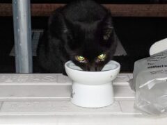 私が「クロちゃん、クロちゃん、ご飯」と、餌の容器を置くと、用心しながら近づいてきました。