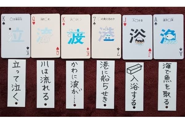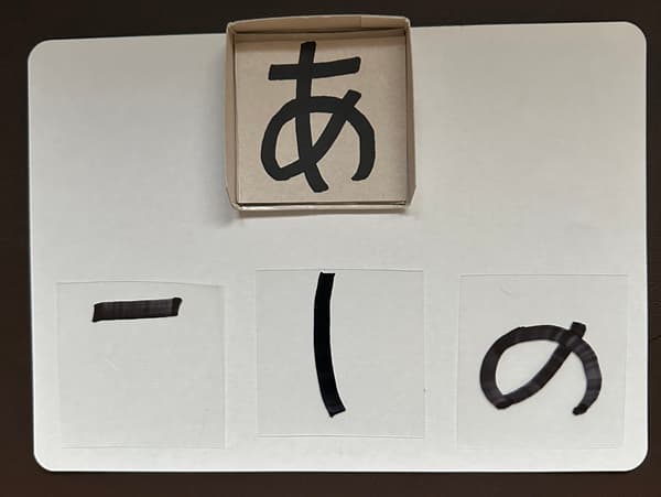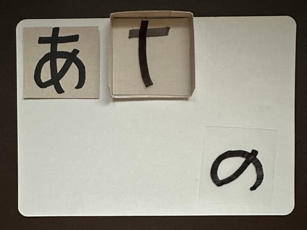 ボール紙に書いた見本の「あ」のカードを置いて、その上に「ー」「|」「の」の線分をのせていきます。