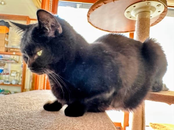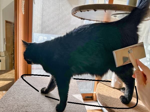 5年目の現在、クロちゃんは私の姿を見ると、奥の部屋の寝床から飛んできて、毛すきをしてほしいのか、キャットタワーで待つ姿勢になります。