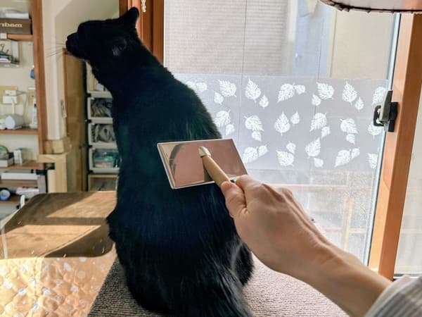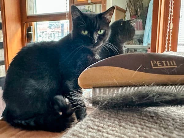 5年目、クロちゃんの好きな鳥の羽で撫でた勢いに乗って、恐る恐る毛すきぐしでもなでてみました。