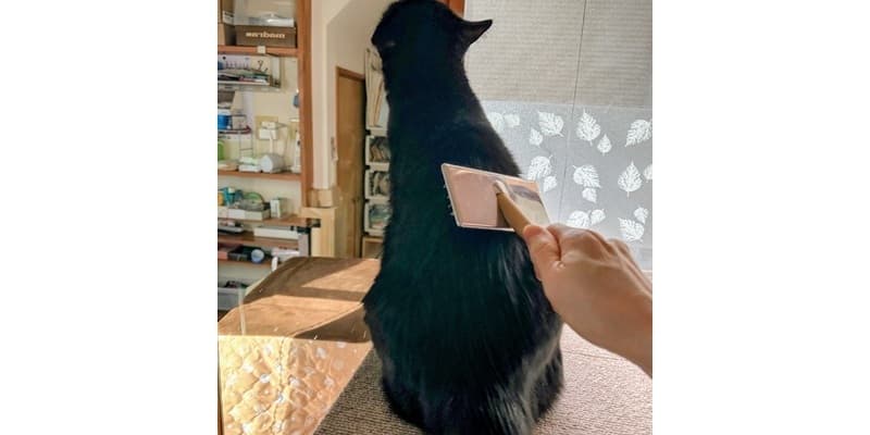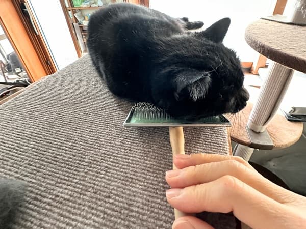 わずかに長毛のクロちゃんに、くしの歯が強く引っかからない限り、弱い力でそーっとすけば、クロちゃんは怒りません。