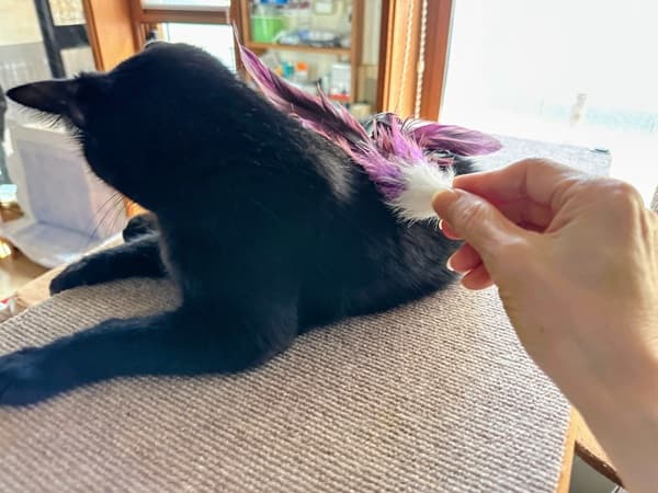 鳥の羽でなでると、クロちゃんは喜びます。「優しいふわふわは好きだ」
