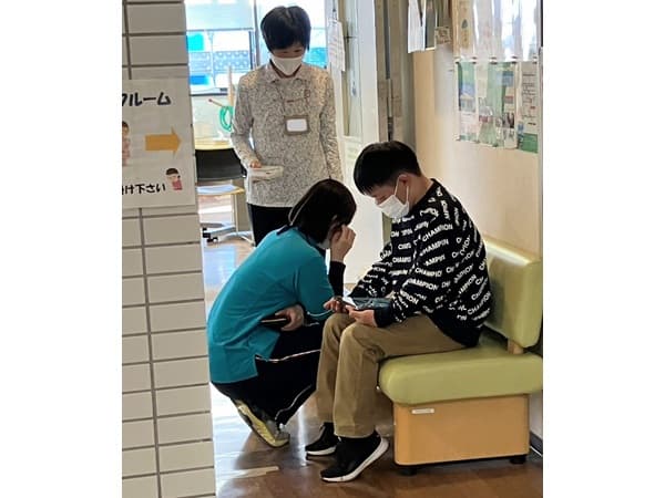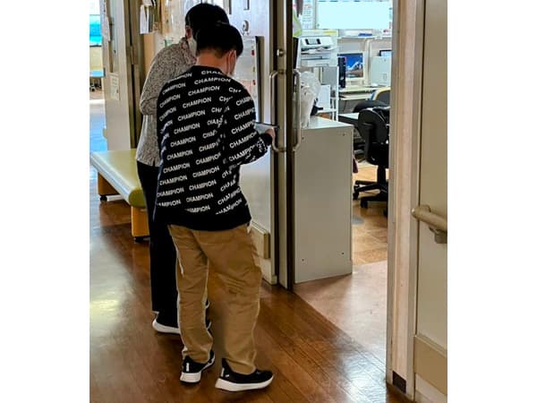 スタッフルームの入り口で、まさや君はiPadの発声ボタンを押します。