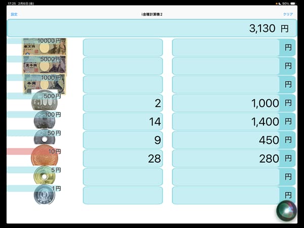 無料アプリ「i金種計算機2」で、売上金の集計をします。