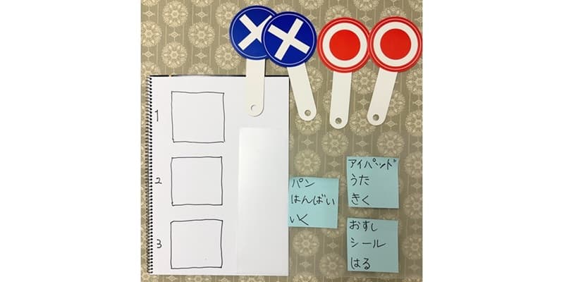 療育の部屋のテーブルについたまさや君に「どれからやりたい?」「1番はどれ?」と尋ねると、まさや君は文字カード「アイパッド うた きく」を指さして選びます。