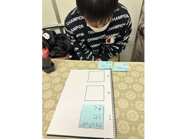 「ここ 貼って」と、私が1の枠を指さすと、付箋紙を置きました。
