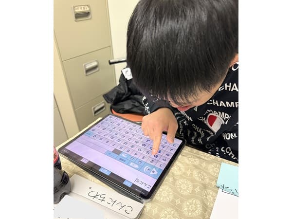 療育の部屋で、iPad に「こんにちわ。 パン いかがですか。」 と入力します。